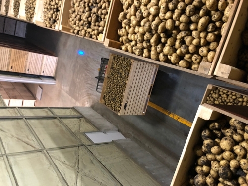 A long loading area (behind the four doors at the front) can load up two tandem trailer units at a time, in insulated, heated comfort. Four 260-by-72-foot storage bins (one each in line with the four doors) hold 44,000 bags of potatoes each in a climate-controlled environment.